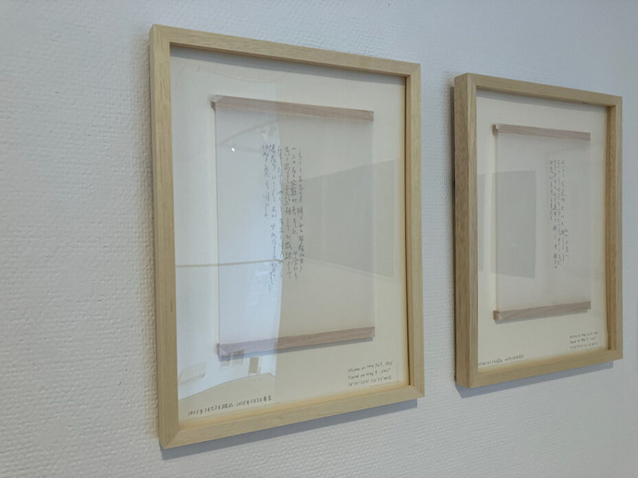 2階へ。心地良さそうな木陰で何かを書いている作家の写真、そのあいだに二重写しになった手紙の作品。これは元の執筆者によって書かれた手紙を、トレーシングペーパー越しに写しとり、痕跡を辿ることで書き手の身体感覚をトレースしようというもの。しかも行為だけに留まらず、元の執筆者が見ていたであろう風景の中で、日時さえもなるべく近づけるなど、可能な限りにじり寄ろうとする行動が半端ではない。先のフィクションもこうした活動を踏まえたものであるならば、〈ありえたかもしれない〉未来が書かれているという創造的な誤解が生まれても、不思議ではない。なんだか次元が歪んできた。
