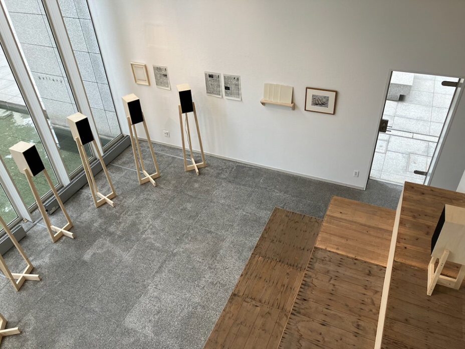 さて、鑑賞である。地上のフロアには大きなひな壇とスピーカーが数台。この会場には何度も足を運んでいるが、ここまで大掛かりなのは珍しい。まるで舞台装置のようだ。ひな壇に座るとスピーカーがみなこちらを向いて、音を発している。複数の若い女性が手紙を読んでいる。透明感があり清廉な響きだが、どことなく怒りのような感情が奥底にあるような気がした。各機ごとにちがう音声なので、一貫性をもって内容を聞き取るのは困難だった。