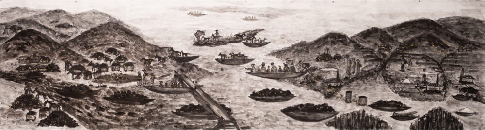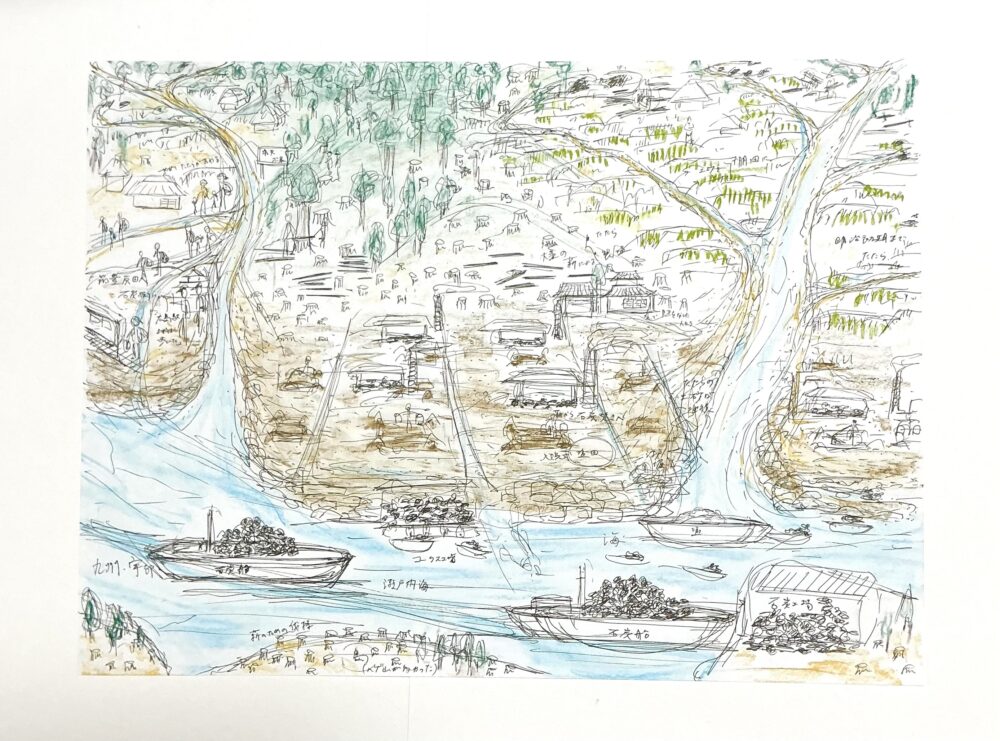 野村は最初、太田川デルタの形成とたたら製鉄の関係についてフィールドワークと作品制作に取り組んだ。次に広島の炭鉱について興味を持ち、活動を進める中で製塩と石炭の関係性や河川による物流を知り、作品を展開した。