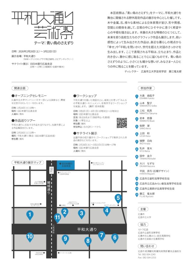本芸術祭は、「青い鳥のさえずり」をテーマに、平和大通りを舞台に開催される野外刻作品の展示を中心とした催しです。