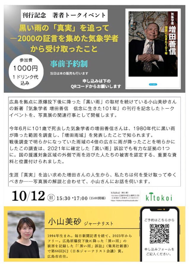 広島を拠点に原爆投下後に降った「黒い雨」の取材を続けている小山美砂さんの新著「気象学者 増田善情念に生きた101年」の刊行を記念したトークイベントを、写真展の関連行事として開催します。